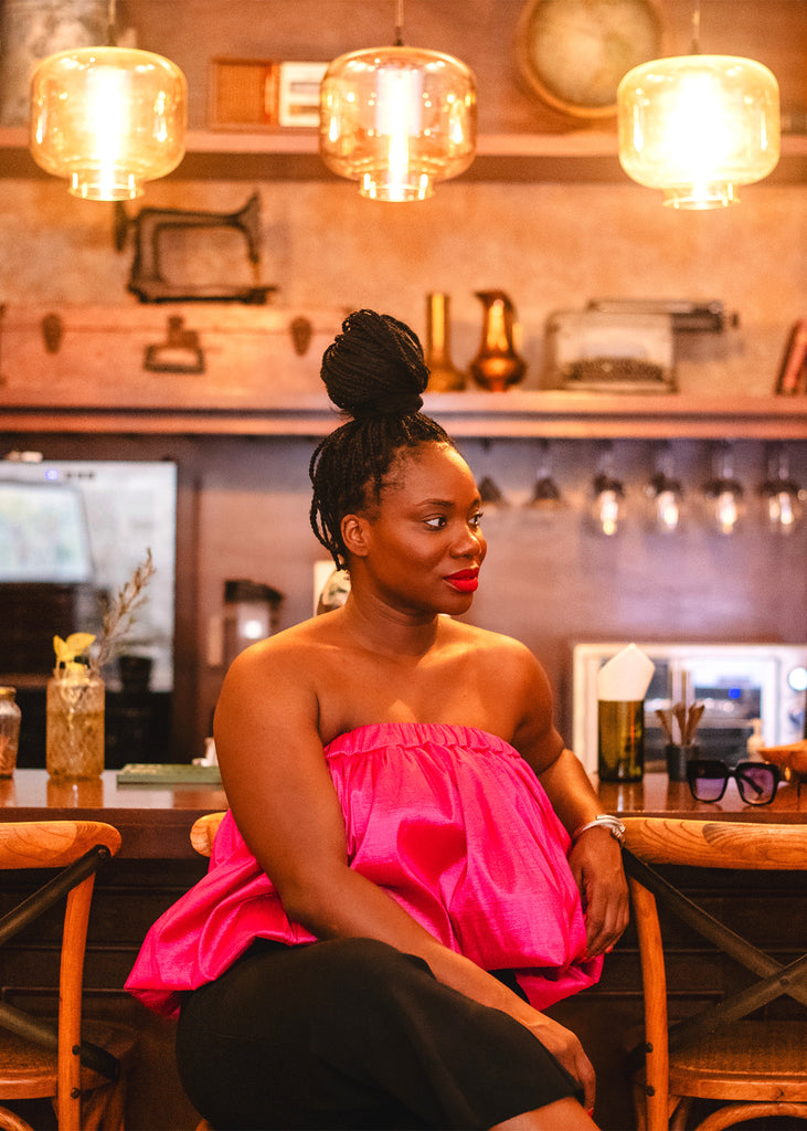 Introducing the "Amelie" Pink Flutter Top, designed to elevate any outfit with a sophisticated pop of color. Featuring a tafetta pink fabric that can be worn horizontally or asymetrically, this design creates a unique style that stands out at events and makes beautiful photos.