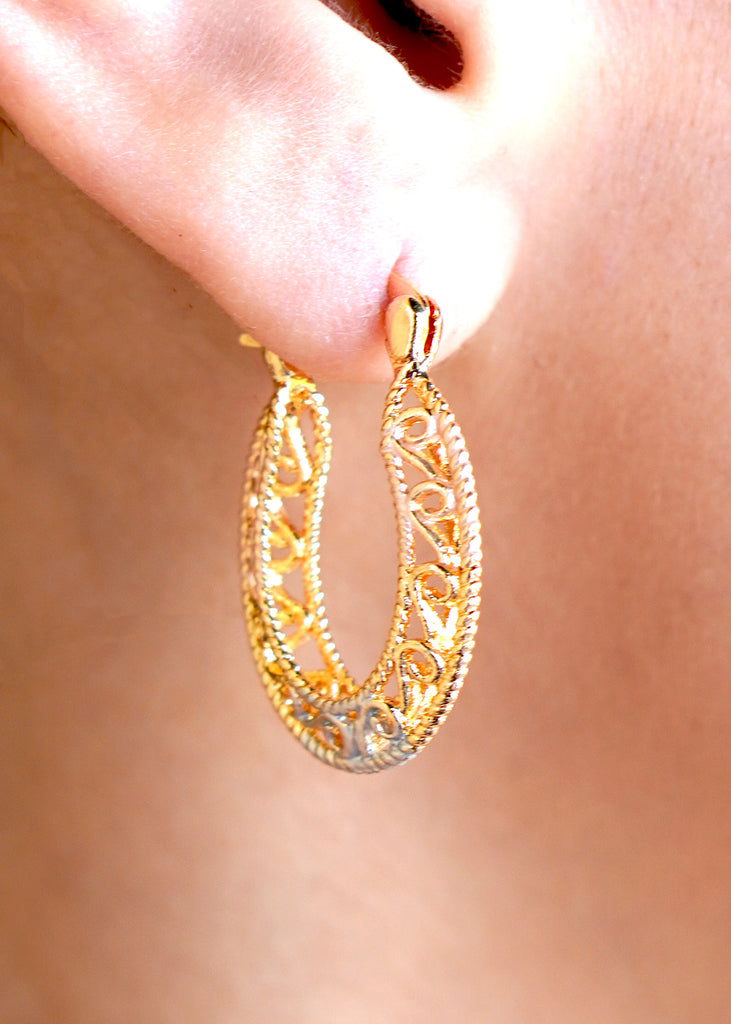 Elevate your everyday look with our Gold Plated Filigree Hoop Earrings. Crafted with intricate filigree design and coated in gold, these earrings are not only stunning but also tarnish-free and hypoallergenic. Part of our exclusive hoop collection, these earrings are a luxurious addition to any outfit.