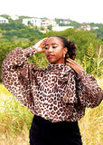 The "Thema" Leopard Top features an elegant oversized sleeve design complemented by a bold leopard print. Its dramatic tie at the neck adds a refined, sophisticated touch, perfect for making a stylish statement with effortless grace.