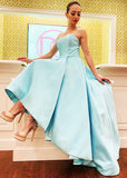 Leave the crowd captivated in flourishing elegance in this Annabelle Strapless High Low Gown. Big Box Pleats with Tapered Waist and matching Mint Ribbon. Sweetheart Neckline and Fully Lined. Color: Only Available in Mint.. Style with your favorite accessories.