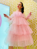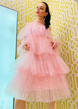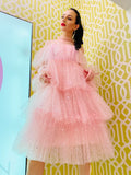 The Sarai Sequin Long sleeves Dress with self tie on sleeves is just perfect for Mom. Great for that Special Party or Photo Shoot. Ruffled high neck with layers of Tulle Sequin of the moon and star all over. Style with your favorite heels or flats. This dress is part of our Mommy & Me Collection.