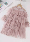 The Sarai Sequin Long sleeves Dress with self tie on sleeves is just perfect for a Princess. Ruffled high neck with layers of Tulle Sequin all over. Gold stars and Moons on Tulle. Style with her favorite ballet flats. Available in Mom's Dress